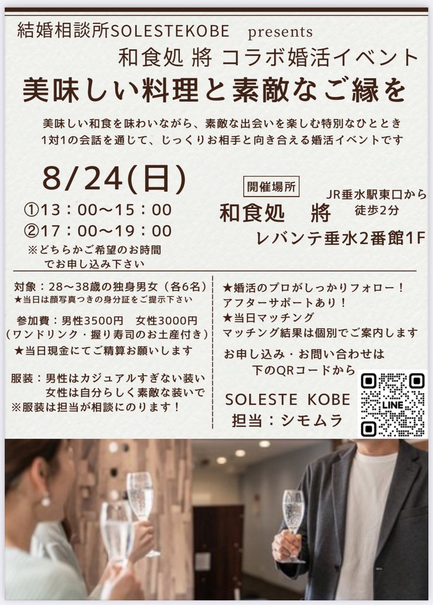 美味しい料理と素敵なご縁を 8月24日(日)①13時~15時 ②17時~19時 @和食処 將 イベントBOX 2025.08.08 「真剣に結婚を考える人が、安心して参加できる出会いの場を垂水から届けたい そして、地域にご縁を生み出し、垂水の未来を少しでも明るくできたら・・・・」 主催者の想いから生まれた婚活イベントです。
