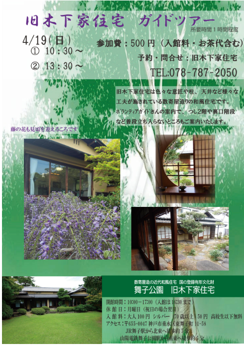 旧木下家住宅 ガイドツアー 2026年4月19日(日) 舞子公園 旧木下家住宅 イベントBOX 2026.03.28 旧木下家住宅の前庭に藤の花が咲く頃、ボランティアガイドさんによる住宅案内とカフェをご利用いただくイベントです。 つし2階や裏口階段など普段立ち寄らない所も案内いただきます。 開催日時 2026年4月19日(日)午前の部:10:30~11:30 午後の部:13:30~14:3 参加費 500円(入館料、お茶代含む)